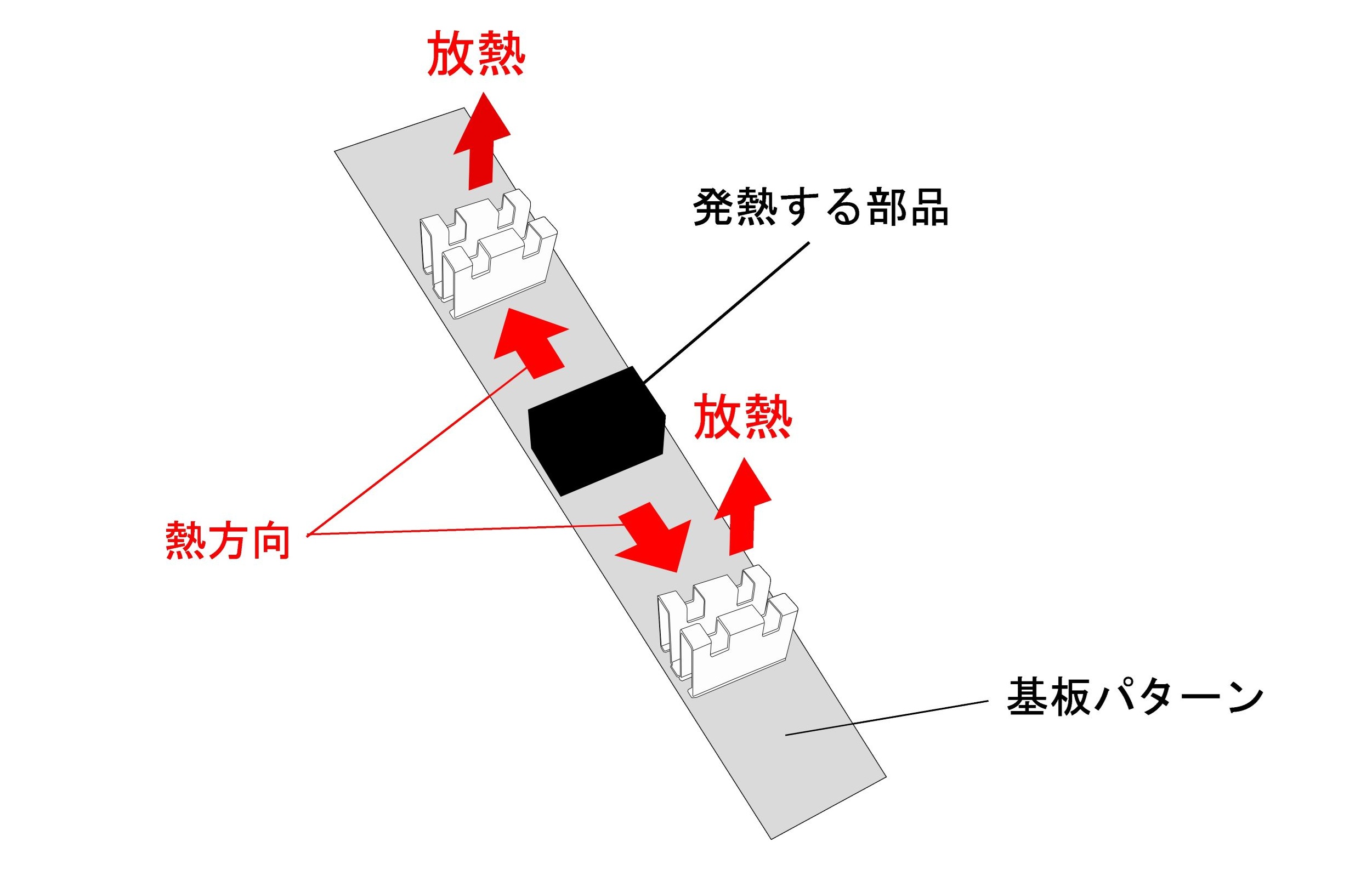 パターン(回路)から放熱端子へ熱を伝導させて空気中に放熱します。放熱端子を実装することで、基板の熱ストレスを低減します。