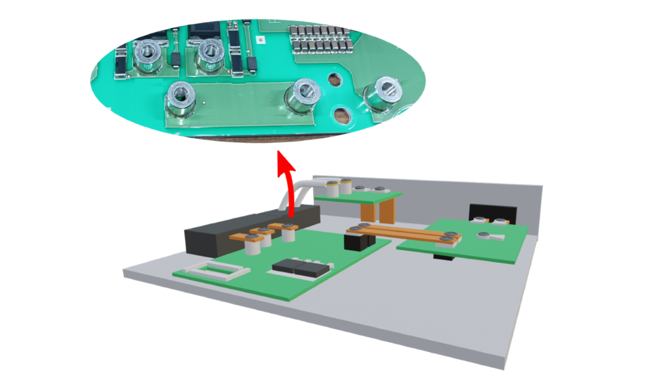 バスバーとネジ締結する際に基板の破損防止と大電流対応で平形スペーサを基板両面に表面実装します。
